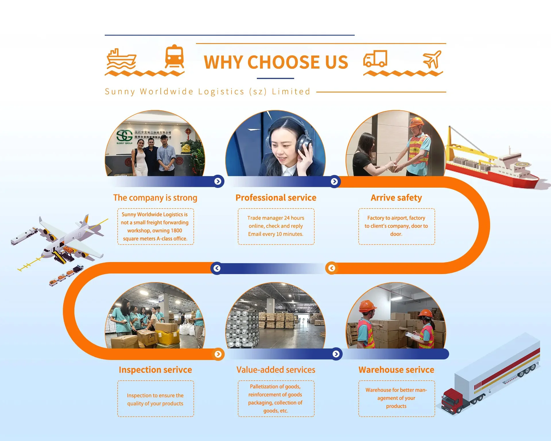 Approccio incentrato sul cliente: In Sunny Worldwide Logistics, i nostri clienti sono la nostra massima priorità. Ci impegniamo a fornire un servizio clienti eccezionale, affrontando qualsiasi dubbio o domanda tu possa avere con professionalità e cura.